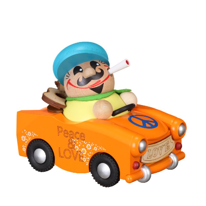 Wie jedes Jahr gibt es auch dieses Jahr eine Sonderedition der Kugelräucherfigur im Trabi aus dem Hause Seiffener Volkskunst, die Kugelräucherfigur Flower Power Trabi **limitiert 2020**.