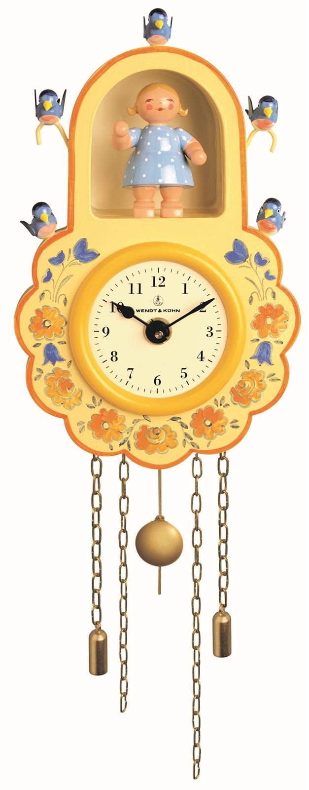 Wanduhr, gelb, mit Mädchen und Vögeln A25